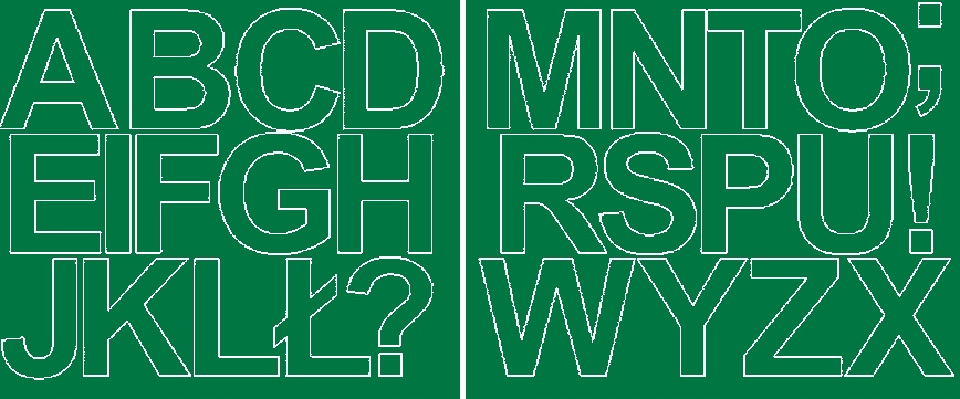 - Ilość: 2 arkusze (25 litery oraz 3 znaki specjalne)