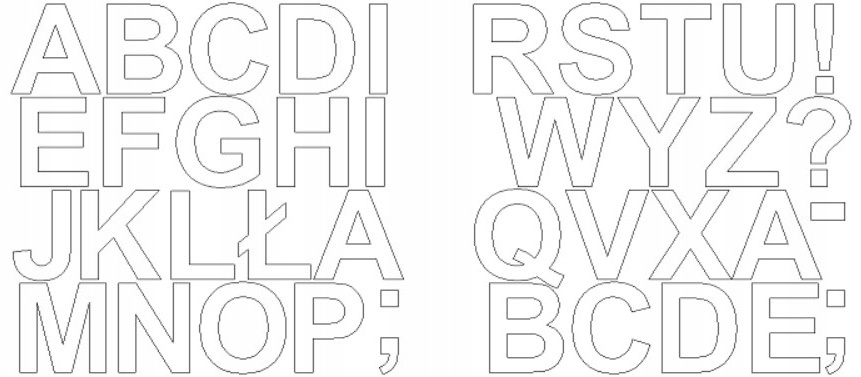 - Ilość: 2 arkusze (34 litery oraz 5 znaków specjalnych)